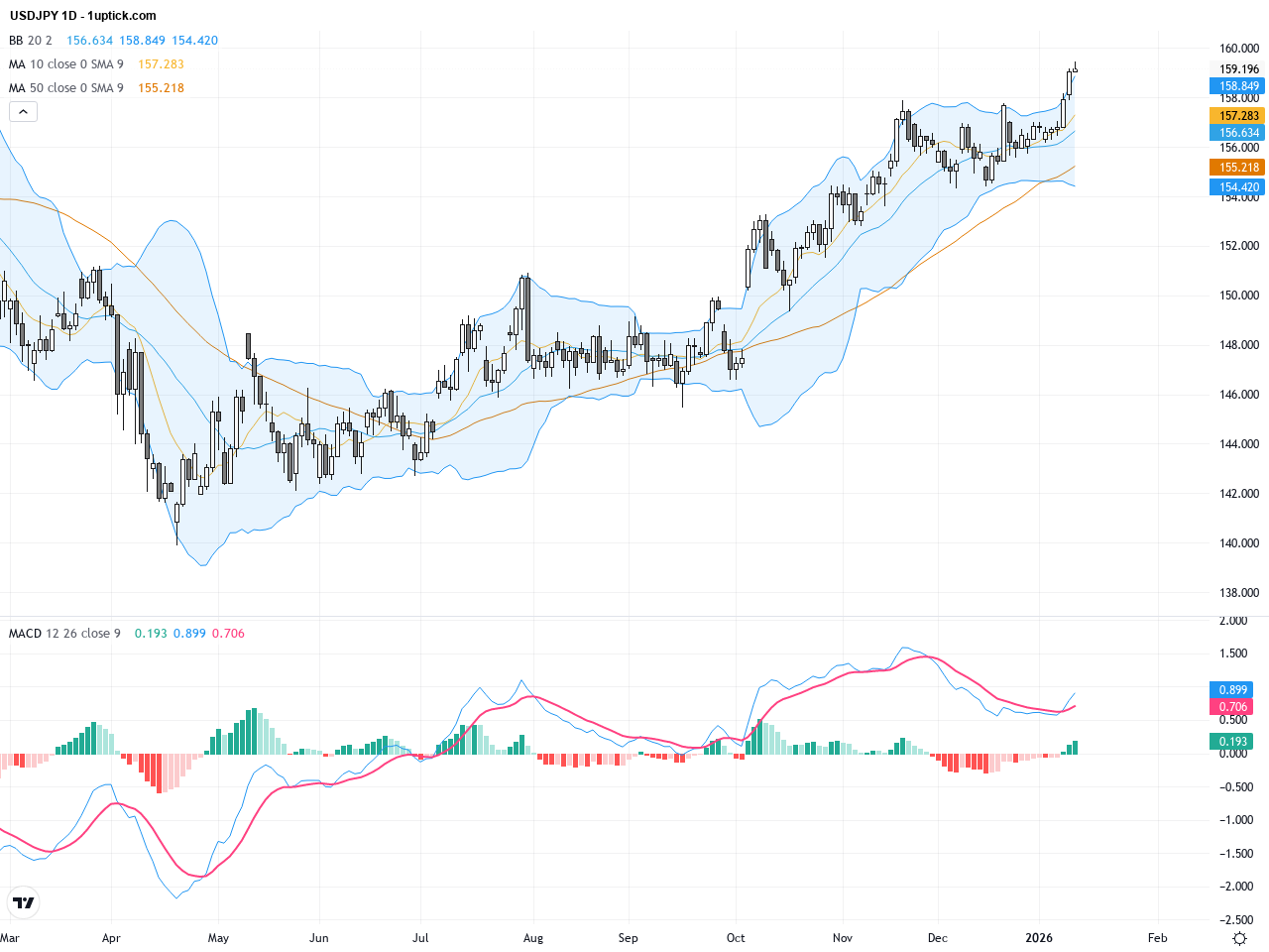 The daily chart reveals a strong bullish trend for USDJPY, with price clearly above the 50-day and 200-day moving averages, confirming sustained upward momentum. The Bollinger Bands have widened, indicating increased volatility. MACD is positive with the fast line comfortably above the slow line and above zero, reinforcing the bullish trend. Price action shows resistance forming near 159, producing some short-term consolidation that traders should watch closely for a breakout or pullback.
