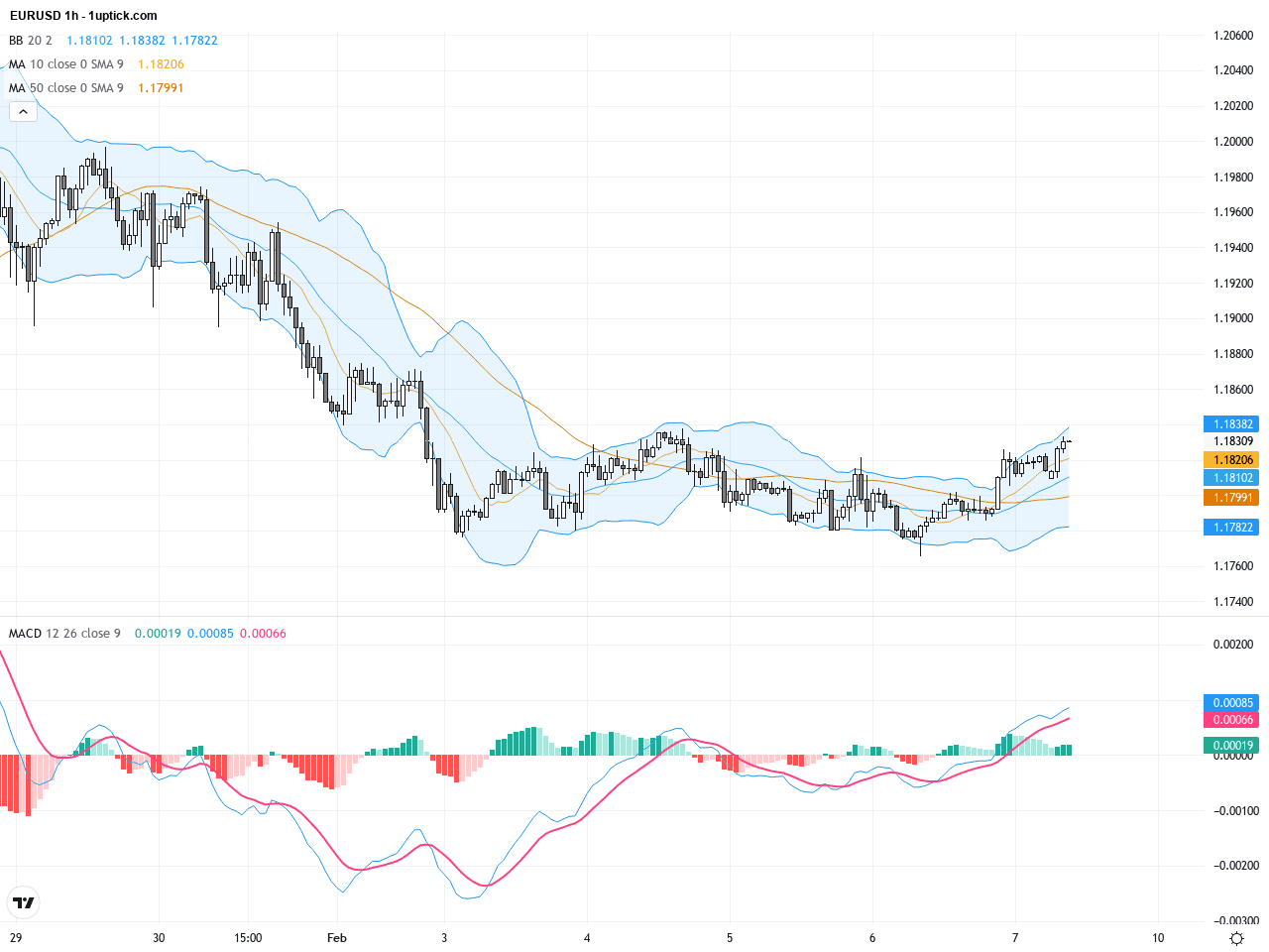The daily chart reveals a clear bullish trend for EURUSD, with prices climbing steadily since early 2026 and having broken above the critical 1.18 resistance. The 50-day moving average at 1.17518 sits above the 200-day moving average at 1.16779, forming a bullish golden cross that reinforces the positive outlook. Bollinger Bands have begun expanding after a recent squeeze, signaling increased volatility. The MACD indicator shows growing positive momentum with rising histogram bars, confirming buying strength. Overall, the trend is steady and optimistic but watch for resistance near the high levels.