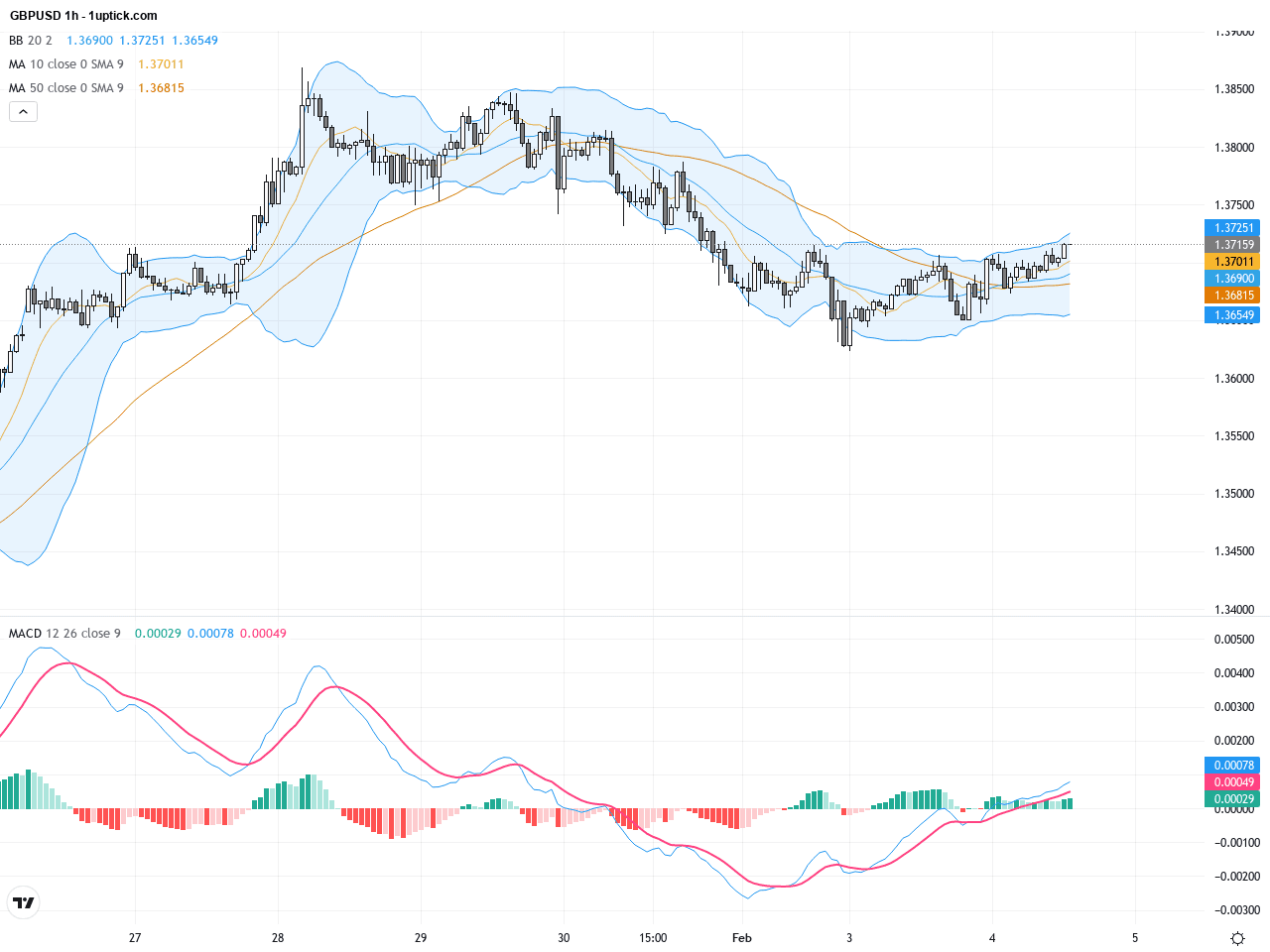 The hourly chart reflects consolidation within the last five trading days, with GBPUSD oscillating between 1.3680 and 1.3730. The nine-day EMA acts as a solid support level, sustaining short-term bullishness. MACD shows a recent bullish crossover above zero, and RSI hovers neutrally but slightly elevated, signaling strengthening buying pressure without full force breakout. Small flag and triangle patterns hint at a possible imminent directional move.