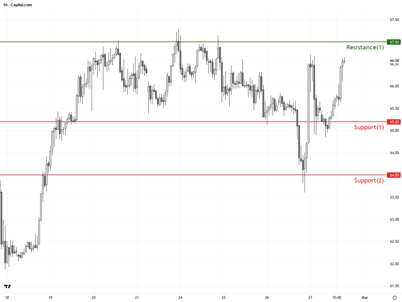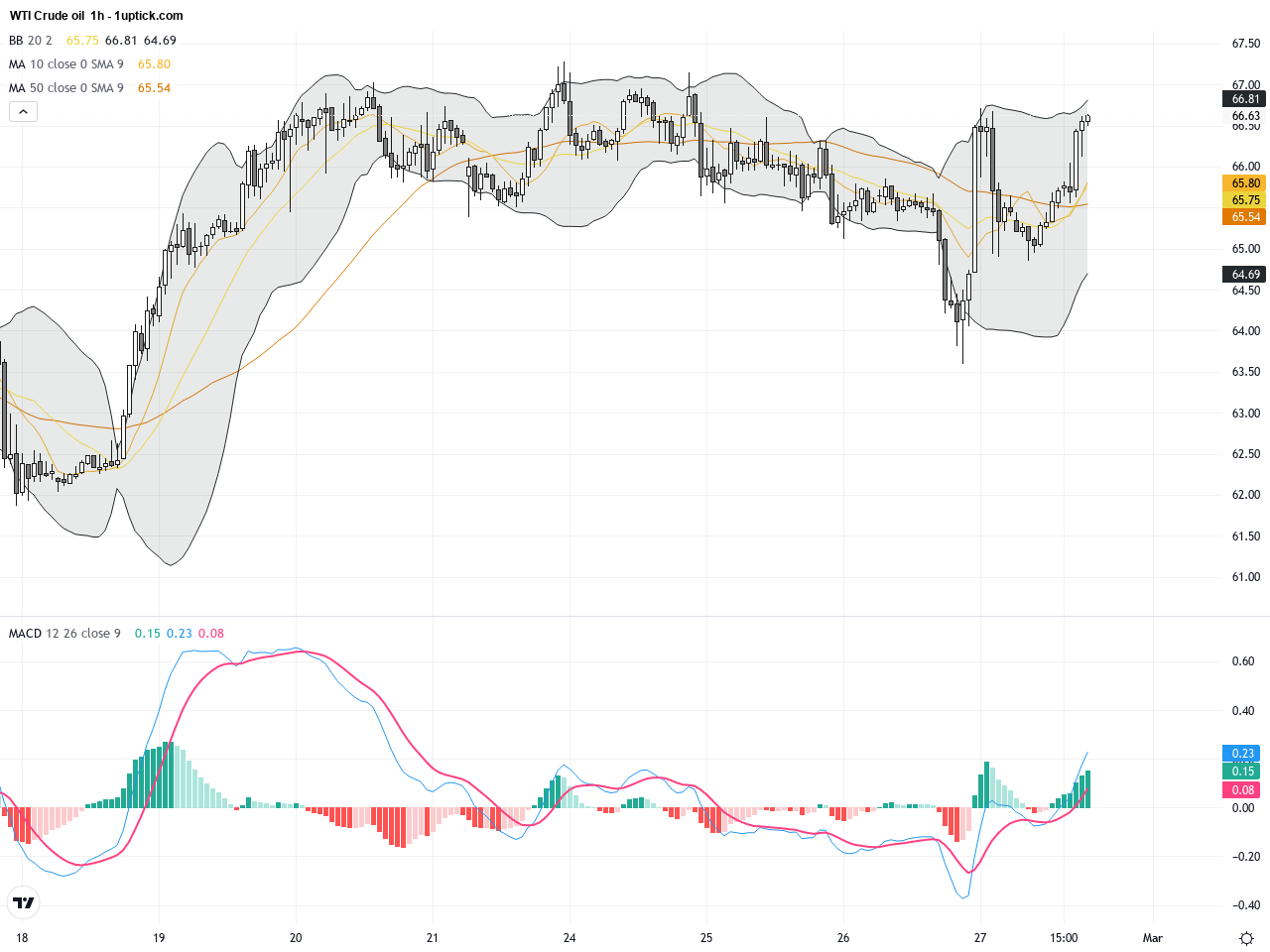 Over the past 5 days on the hourly chart, WTI has shown a steady upward bounce from a $63.6 low to about $66.5. Short-term moving averages align in a bullish pattern with multiple re-tests of the middle Bollinger Band acting as support. A double bottom on the MACD with a subsequent golden cross points to gaining short-term momentum. Recently formed Doji candlestick suggests temporary market hesitation, hinting at a possible short-lived consolidation or minor pullback.
