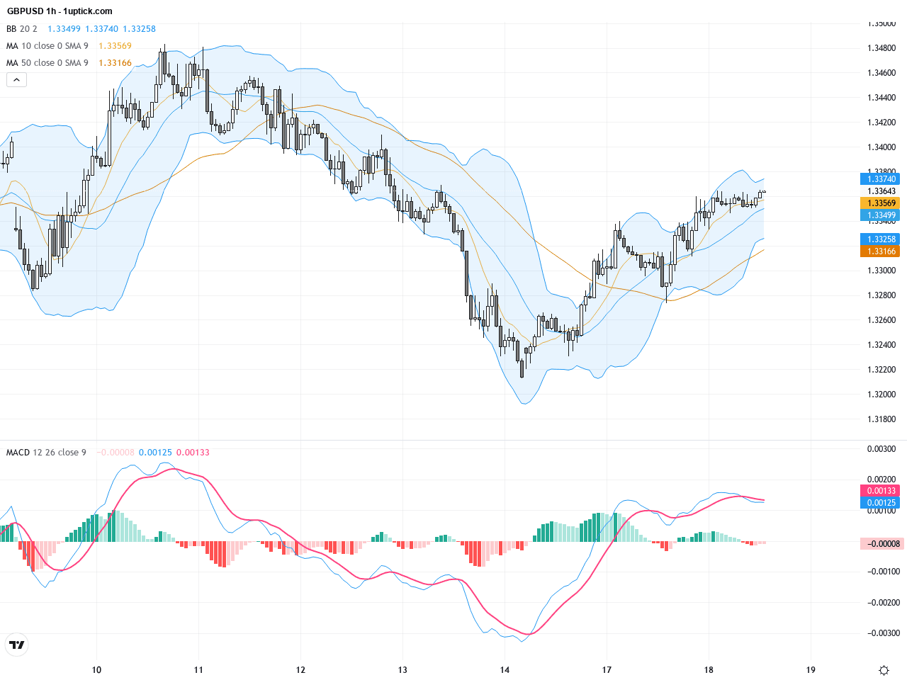 On the hourly chart, GBPUSD has been oscillating within a narrow range of approximately 1.3346 to 1.337 over the past 3 to 5 days. Short-term moving averages are intertwined, lacking a clear directional trend. The Bollinger Bands have contracted with the price nearing the lower band but without breaking down. The MACD histogram shows signs of convergence, suggesting waning bearish momentum. A recent doji candle indicates market indecision, pointing towards a potential directional shift in the near term.