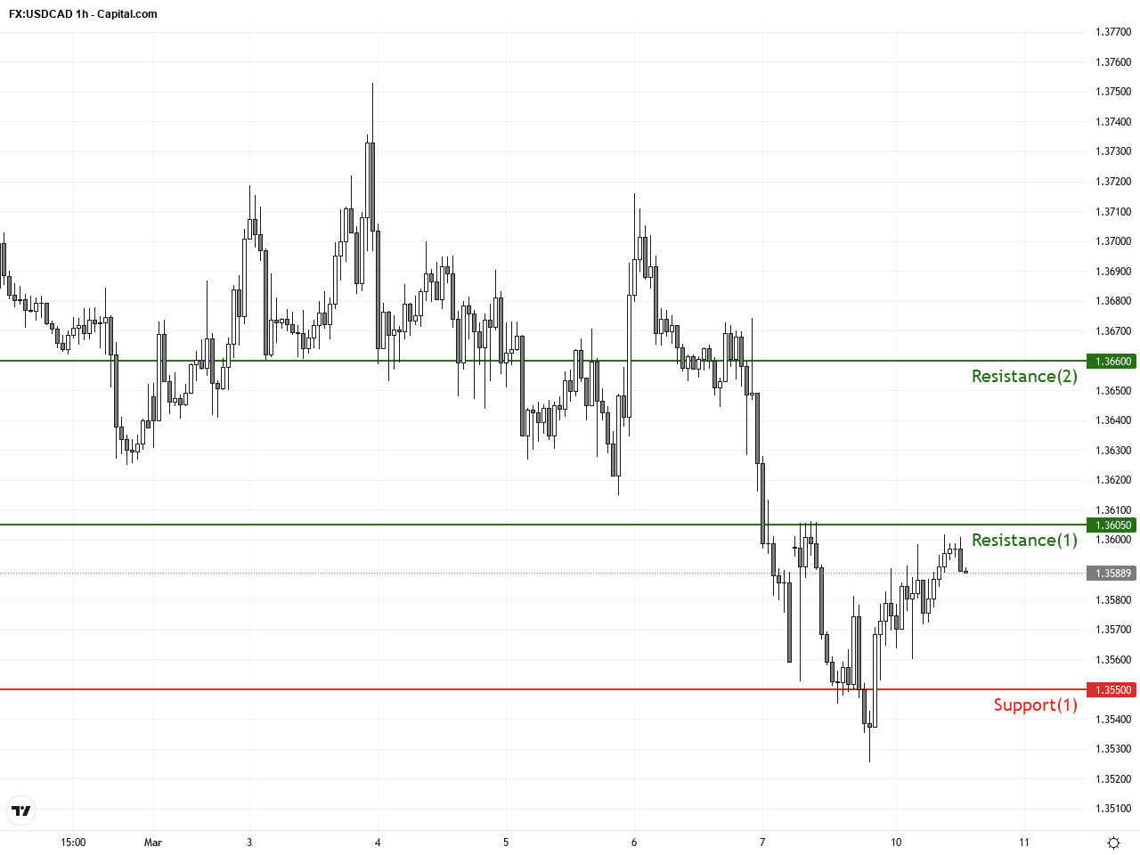 Over the past 24 to 48 hours, the USD/CAD currency pair exhibited noticeable volatility. After fluctuating slightly around yesterday’s closing price of 1.35894, market attention was firmly drawn to oil prices breaking above $100 per barrel. Tightening oil supply both in the U.S. and globally pushed prices higher, boosting demand for the Canadian dollar, which typically correlates positively with oil price movements due to Canada’s major role as an oil exporter. As a result, the USD/CAD rate edged lower from yesterday, reflecting stronger demand for the Canadian dollar.