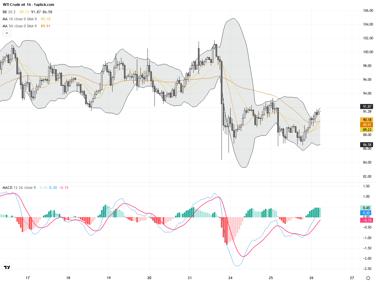 The daily chart illustrates WTI’s descent from a mid-March peak of $115.58 to approximately $90, forming a clear downtrend. The 20-day and 50-day moving averages have crossed bearish, indicating medium-term selling pressure. Bollinger Bands are tightening, suggesting declining volatility and a potential trend reversal. MACD remains negative but is approaching the zero line, signaling a possible short-term bounce. Overall, WTI is compressing near critical support levels awaiting a breakout or breakdown.