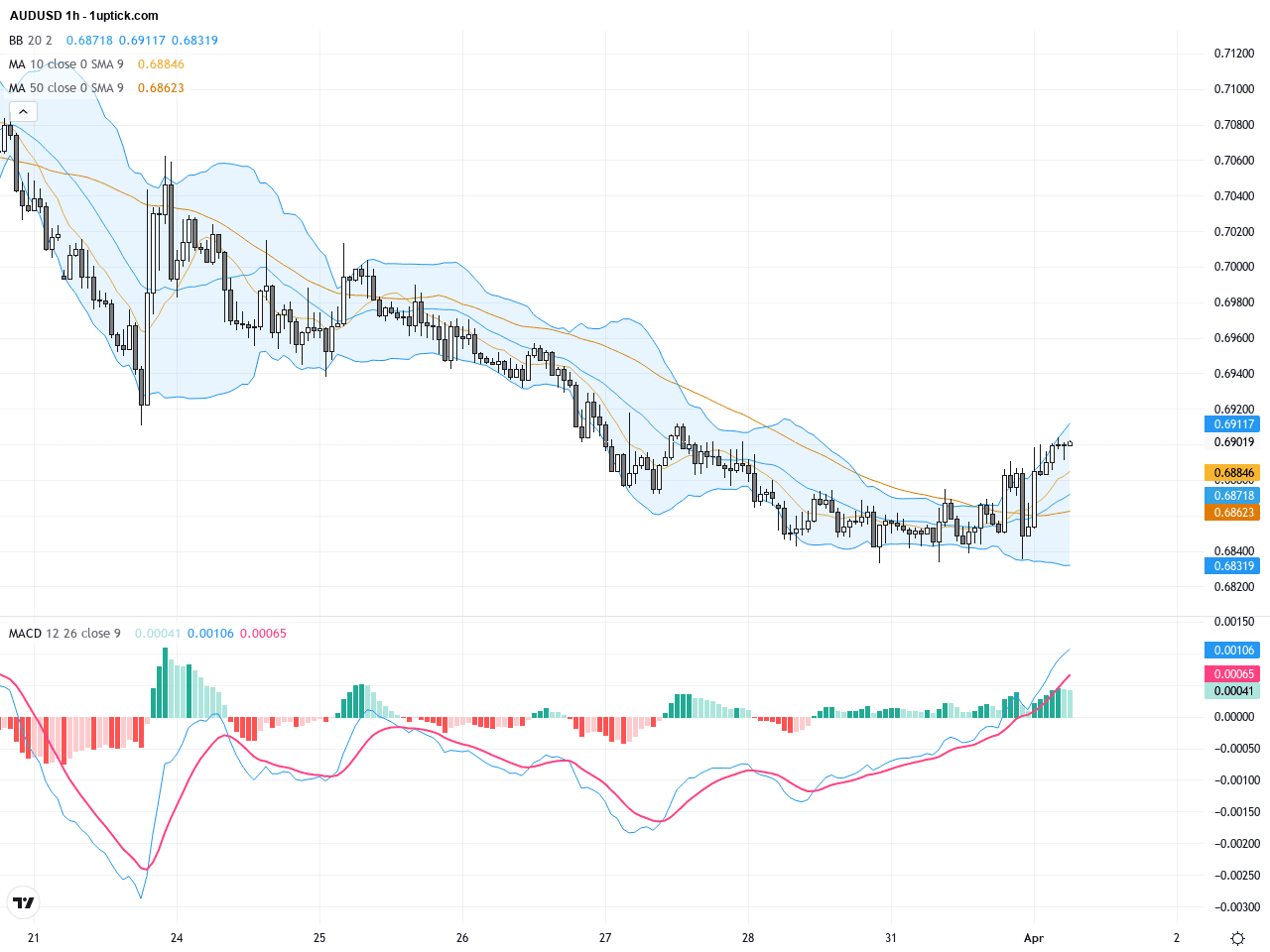 On the hourly chart, price action consolidates around the 0.6850 level with narrowing trading ranges. A double bottom pattern formed near 0.6835 has sparked a rebound up to around 0.6900, where resistance appears. The 20 and 50 EMA lines have made a bullish crossover, signaling increased short-term upward momentum. The MACD histogram shifting from negative to positive supports this momentum shift, although proximity to the upper Bollinger Band suggests resistance ahead that traders should guard against.