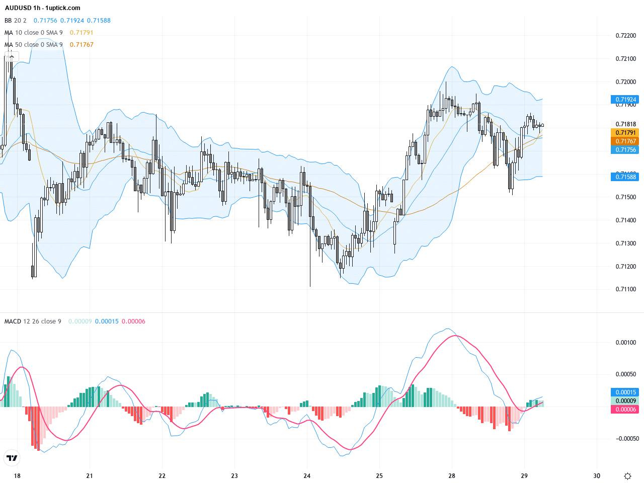 On the hourly chart spanning the last 3-5 days, AUDUSD shows an upward oscillation, recently testing resistance around 0.7195. Short-term moving averages align bullishly, with the 50 EMA crossing above the 100 EMA, signaling strengthening momentum. The MACD hints at a bullish crossover soon, while tightening Bollinger Bands suggest an end to consolidation and potential breakout. A recent hammer candlestick with a long lower wick highlights fresh buying interest rejecting lower prices.