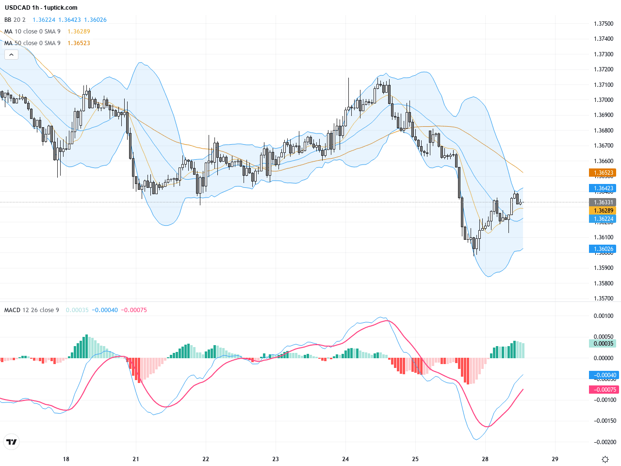 On the hourly chart, USDCAD has experienced heightened volatility over the last 3-5 days, fluctuating within the 1.363 to 1.368 range. The pair repeatedly tested the 200-hour EMA but failed to secure a breakout, marking the line as resistance. Bollinger Bands expansion indicates increased short-term volatility. Recently, a bearish engulfing candlestick pattern emerged, signaling likely continuation of the downward move in the next 24 hours. MACD momentum is fading as histogram bars compress, pointing to a market awaiting decisive direction.