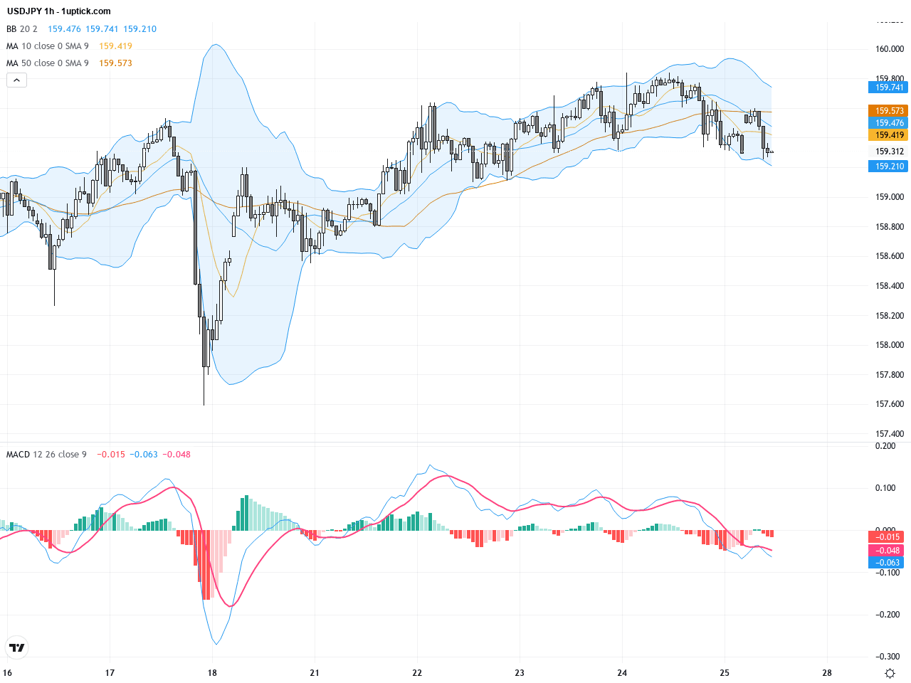 Analysis of the last 3-5 days on the hourly chart reveals price oscillating between 159 and 160.5, with moving averages coalescing near 159.5 acting as short-term support. The MACD recently formed a bullish crossover, indicating upward momentum may build shortly. The Bollinger Bands’ narrowing reflects a market awaiting catalyst, and the triangular formation anticipates a near-term breakout. Traders should watch for volume and volatility expansion to confirm directional bias.