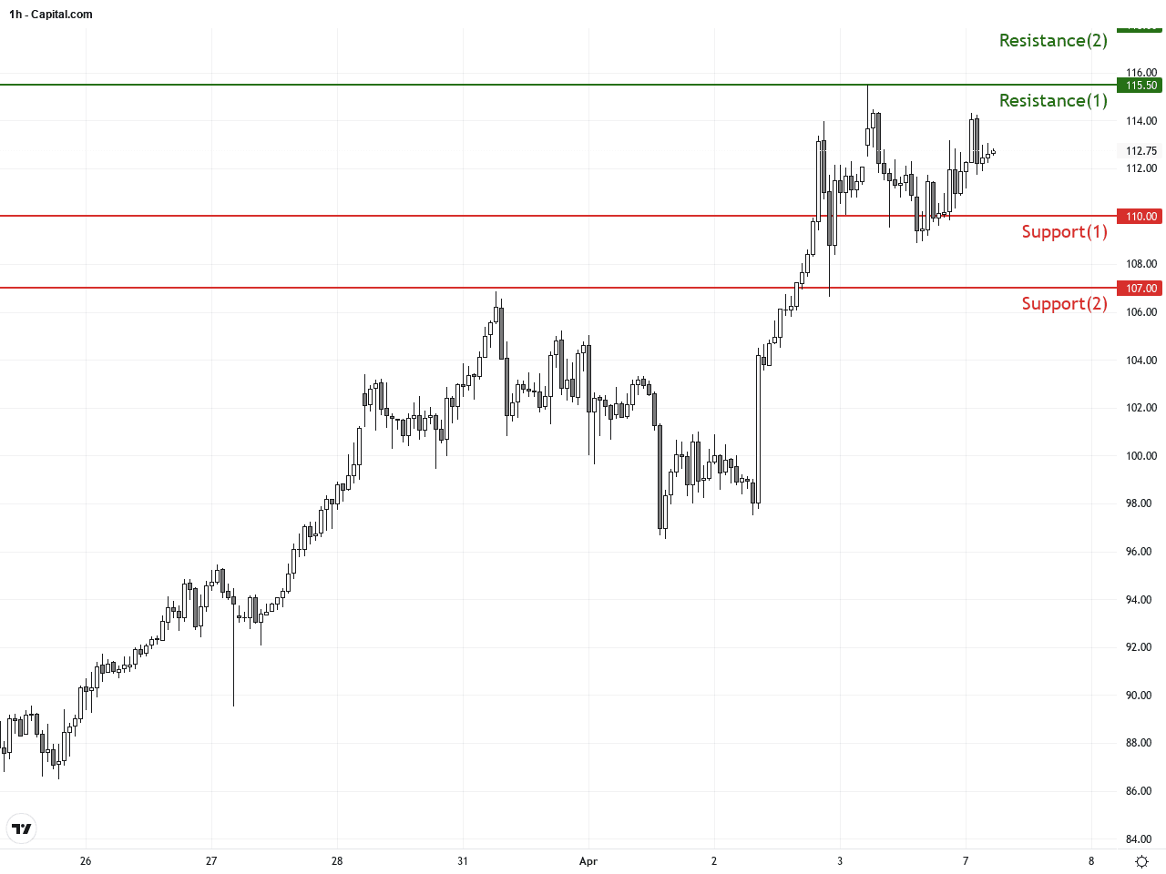 On the hourly timeframe, WTI has experienced elevated volatility over the past 3 to 5 days, consolidating between $111 and $115 and forming a bullish flag pattern since the sharp gap-up move on April 3. The 10-EMA is providing steady support and MACD remains positive but hints at a slight consolidation. The recent bullish engulfing candlestick suggests a potential continuation upward in the next 24 hours. A breakout above the flag’s upper boundary could trigger a fresh rally.