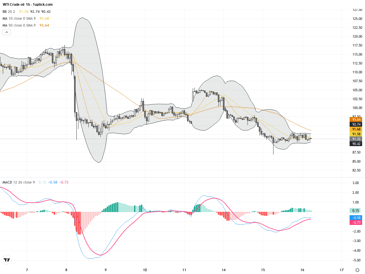 Hourly analysis reveals WTI testing the critical $90 psychological support multiple times over the past 3-5 days. Several hammer candlesticks have emerged, suggesting underlying buyer presence at this level. Short-term moving averages show brief bullish crossovers but on low volume, indicating limited strength in rallies. Bollinger Bands have tightened and MACD hovers near zero, reflecting indecision and congestion. The price action signals a near-term tug-of-war, urging caution for traders watching breakout directions.