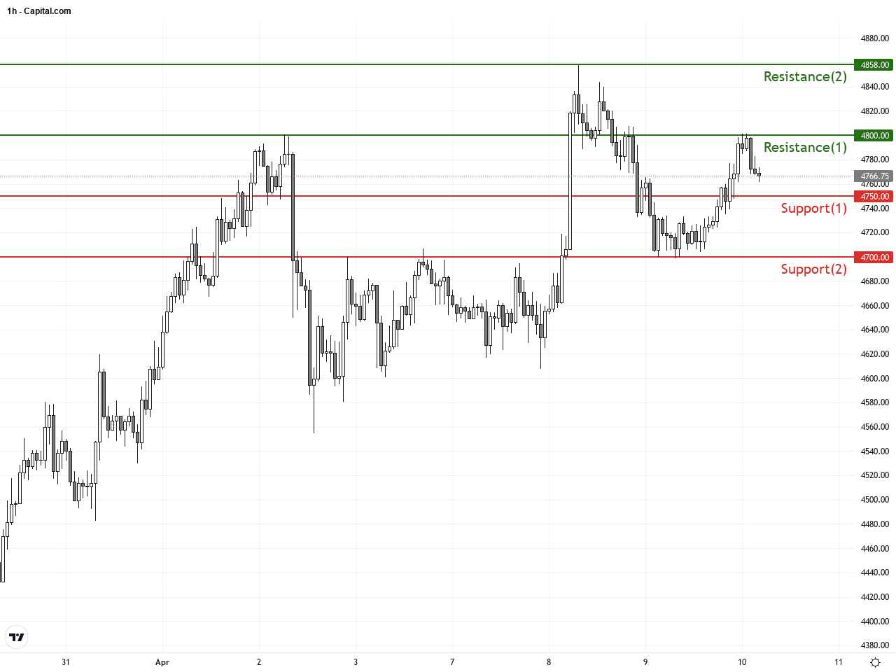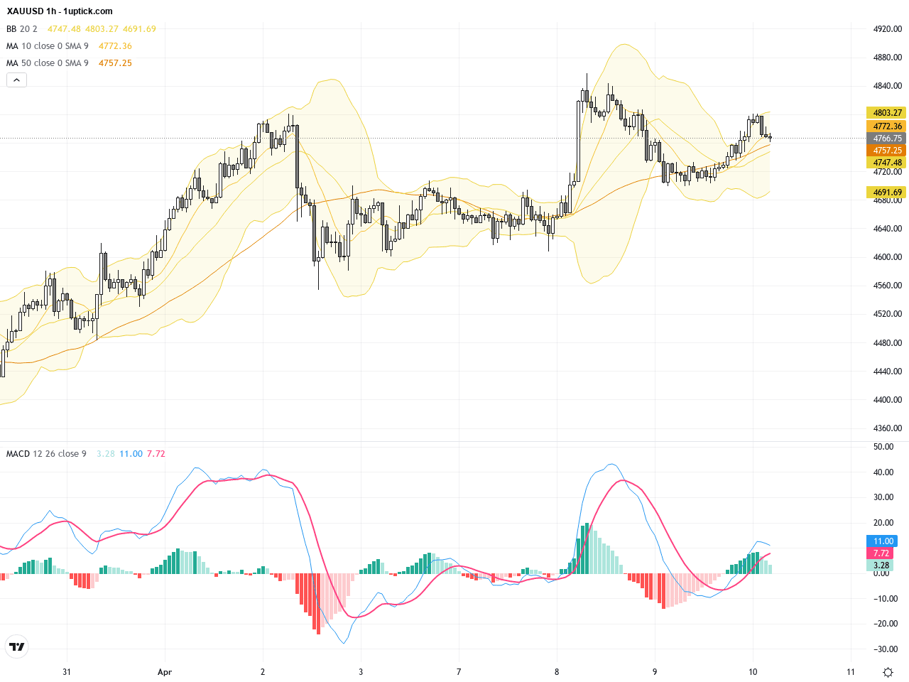 The daily chart reveals an overall uptrend in XAUUSD, climbing from around $4500 in mid-March to near $4800. The price faces strong resistance at $4800 and $4900 levels. Bollinger Bands remain skewed to the upper band, indicating ongoing upward pressure. Moving averages like the 20-day and 50-day MA show bullish alignment, and the MACD continues a positive expansion, supporting a sustained bullish longer-term trend.